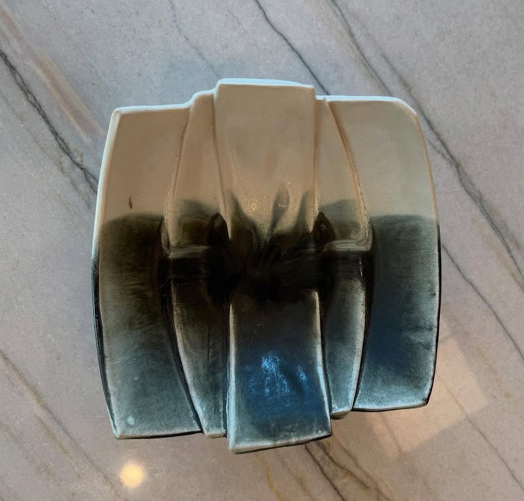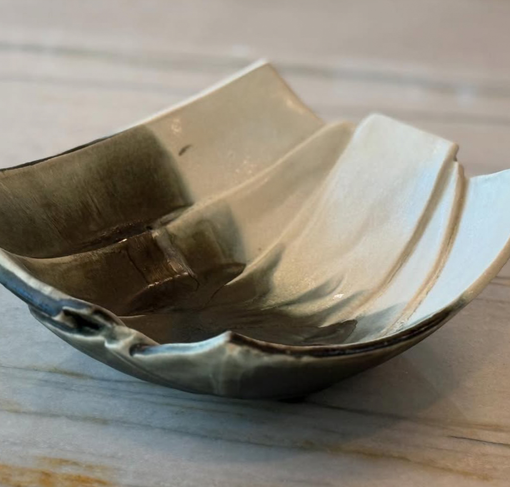 The Quiet Divide is a small hand-crafted bowl composed of layered rectangular forms, creating a striking interplay between structure and softness. A single defining line runs through the piece, separating deep olive green from clean white—an intentional contrast that feels both modern and grounded. For those drawn to subtle statement pieces, this bowl offers visual interest without excess, blending architectural rhythm with organic craftsmanship.
